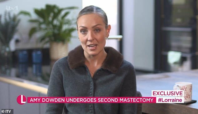Amy explicó a las cámaras: ‘El año después de que terminé mi quimioterapia activa hace dos años, desafortunadamente con mi mamografía, me levantaron vasos en el otro seno.