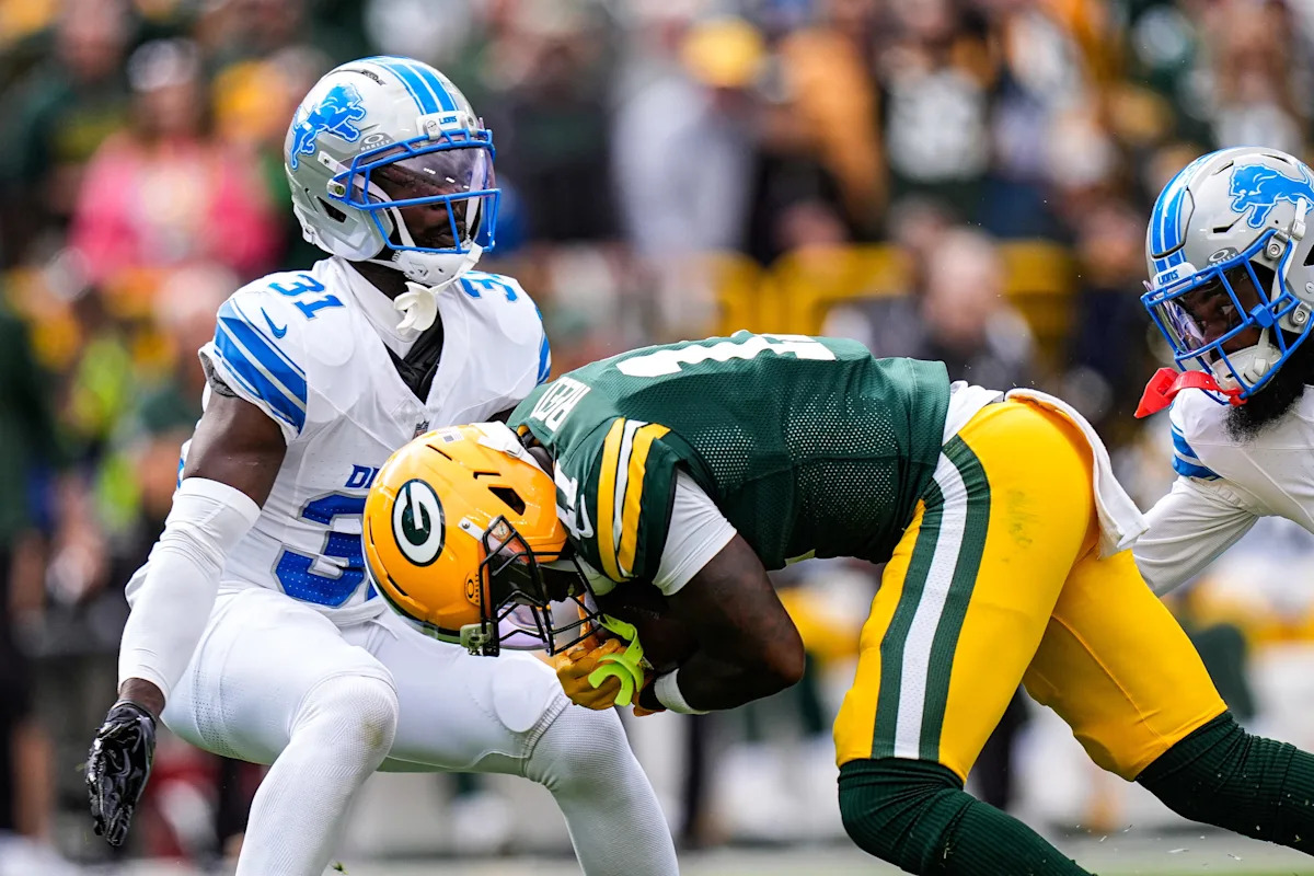 El safety de los Detroit Lions, Kirby Joseph (31), aborda al receptor abierto de los Green Bay Packers, Jayden Reed (11), durante la primera mitad en Lambeau Field en Green Bay, Wisconsin, el domingo 7 de septiembre de 2025.
