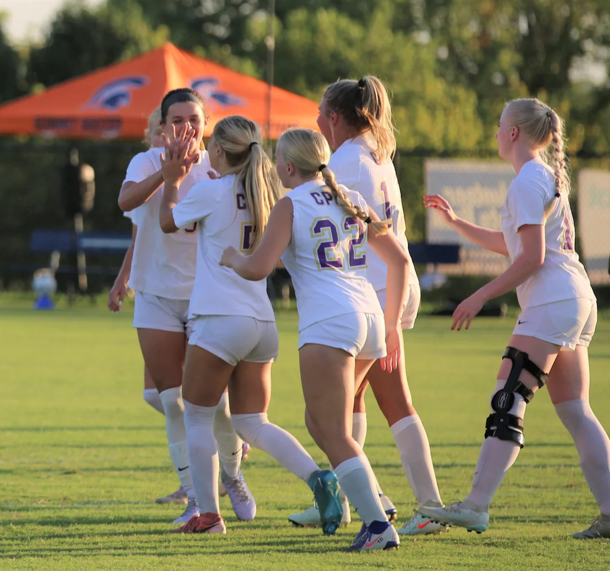 Livi Langan de CPA celebra con sus compañeros de equipo después de anotar de penal en la victoria por 3-2 sobre Summit el 21 de agosto de 2025.