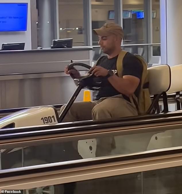 En un video viral, un hombre de maldad fue arrestado después de robar el carrito de golf del aeropuerto y llevado a una pasarela en movimiento para Joyride.