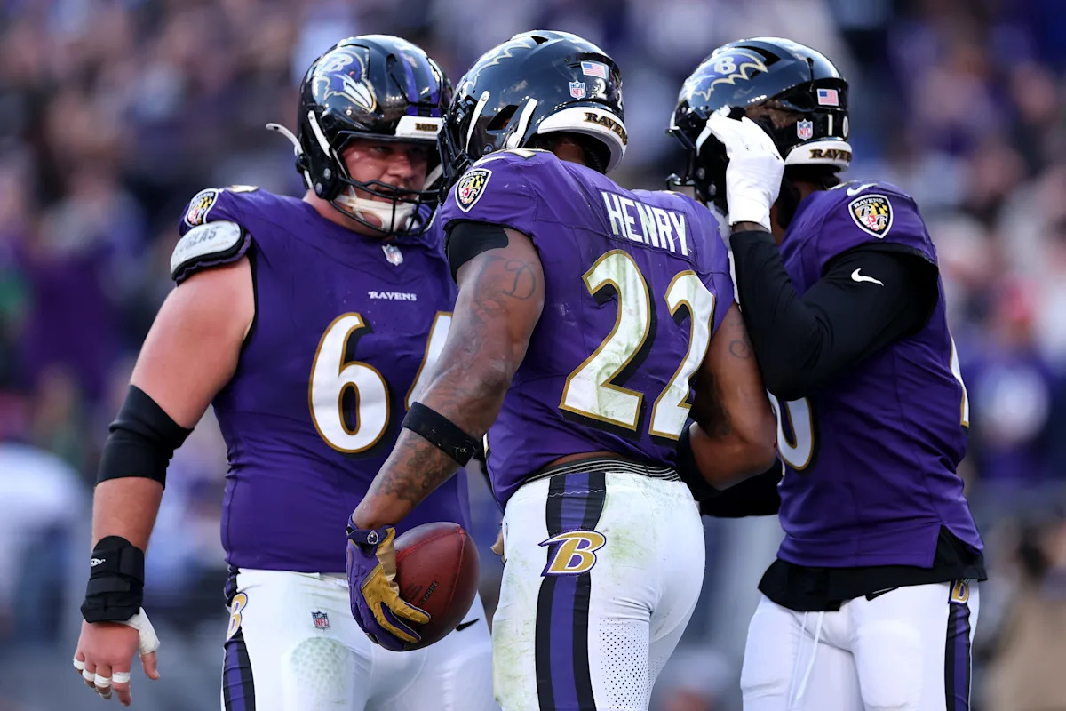 Derrick Henry celebra con Tyler Linderbaum, izquierda, y DeAndre Hopkins después de que los Baltimore Ravens anotaron un touchdown en el tercer cuarto contra los New York Jets en el M&T Bank Stadium el 23 de noviembre de 2025 en Baltimore.