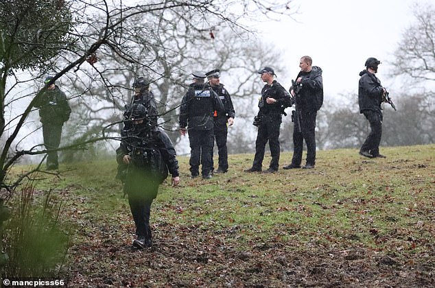 Se vio al menos a ocho agentes respondiendo al animal rebelde en la granja de Gawsworth. Se ve a cinco personas portando escopetas y rifles de asalto.