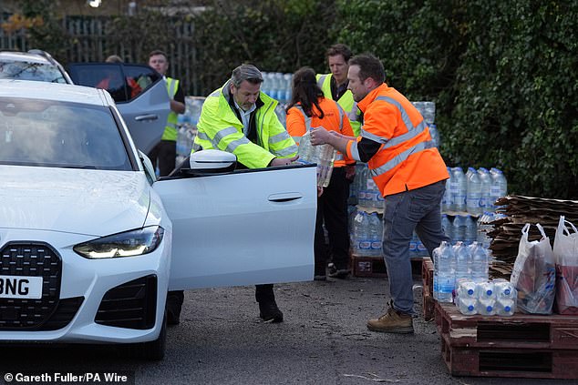 Un trabajador reparte agua embotellada en el centro deportivo Tunbridge Wells después de que las personas en el área experimentaran baja presión de agua desde el sábado por la noche.
