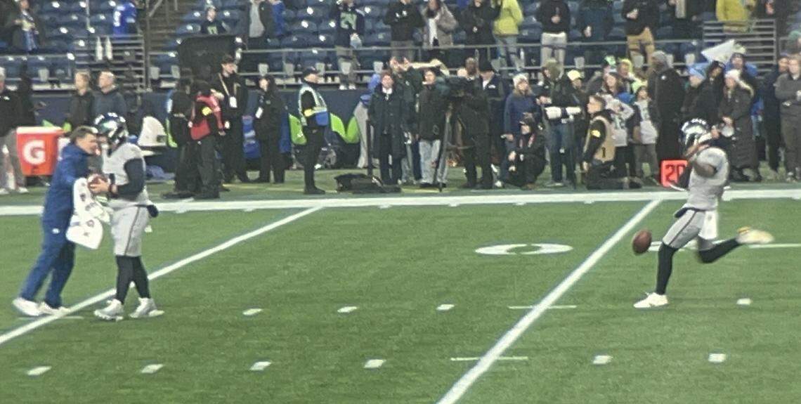 El apostador Michael Dixon (derecha) comienza antes del juego antes de que los Seahawks jueguen contra Los Angeles Rams, el jueves 18 de diciembre de 2025, en Lumen Field en Seattle. Los Seahawks usaron nuevos “uniformes rivales” de color gris y verde claro para el juego.