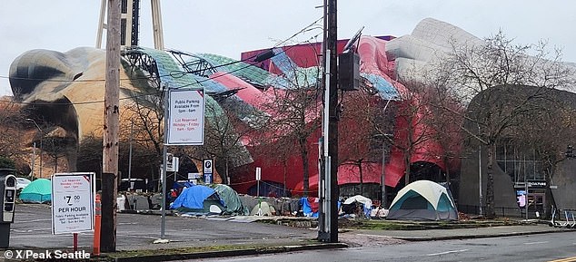 Los usuarios de las redes sociales dicen que el campamento para personas sin hogar cerca del museo y la icónica Space Needle (en la foto) comenzó hace meses.